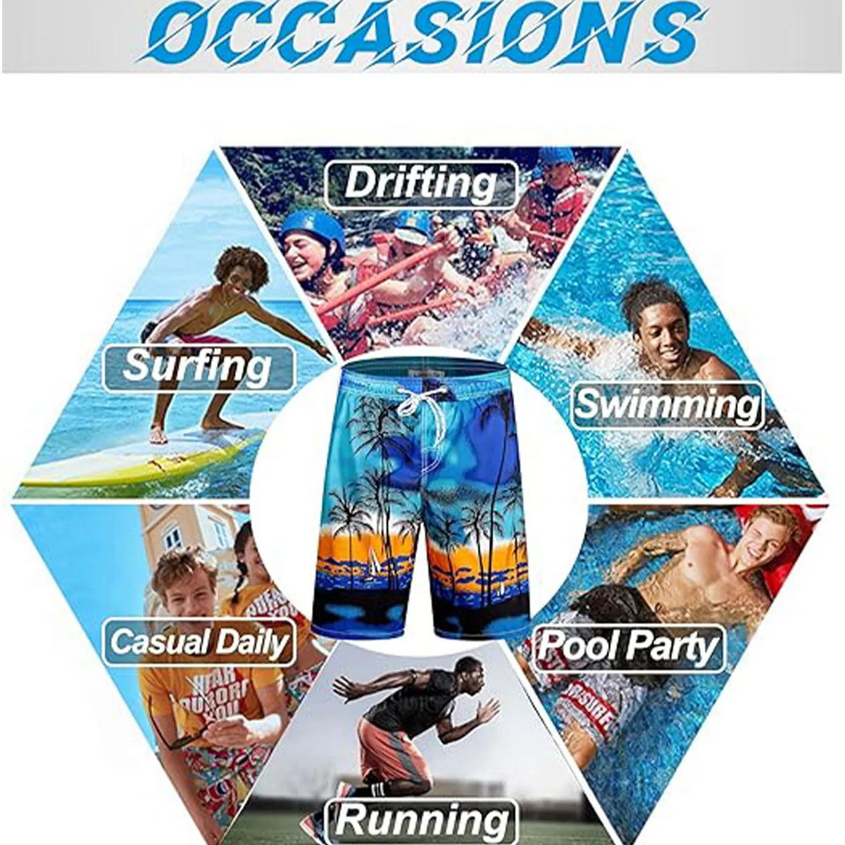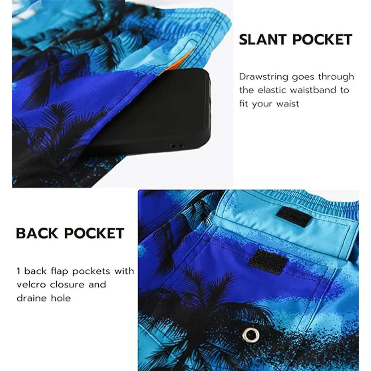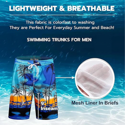 Made of high-quality polyester with quick-drying and water-repellent technology. They are lightweight and soft, with a UPF of 50+. 9 inch inseam, the length hits your knee. The swim shorts have a soft mesh liner to keep you dry all day long and provide a relaxed and comfortable wearing experience. The elastic waistband with drawstring allows you to adjust the fit to your waist freely. These beach shorts have two slanted mesh pockets and one back cargo flap pocket with and a drain hole to help water flow down and achieve quick drying. These long swim shorts are ideal for swimming, pool parties, beach walks, diving, surfing, cruises and everyday casual wear. 19.7" L x 11.8" W x 1" H.